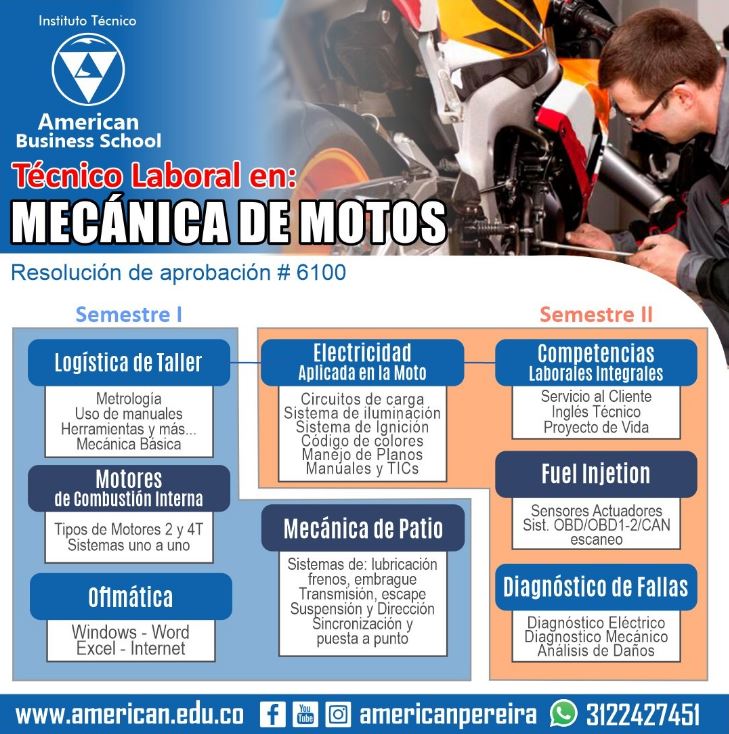 - Un técnico en mecánica de motos puede trabajar en cualquier país, o montar su propio taller en Colombia, cada vez son más la cantidad de motos que circulan en las calles debido a su facilidad de adquisición y mantenimiento y por ende es también mayor la demanda de técnicos calificados, formados con los mejores contenidos y recursos que encontrará con nuestra sede especializada para el programa. American Motors, ubicada en el centro de la ciudad.