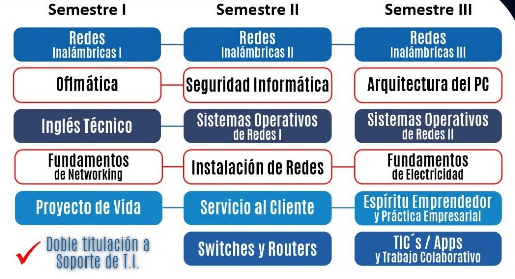 Además, al finalizar, podrá optar por la doble titulación con las carreras Técnicas de Soporte y Mantenimiento de T.I. en solo un semestre adicional , o continuar con alguno de nuestros diplomados de profundización.